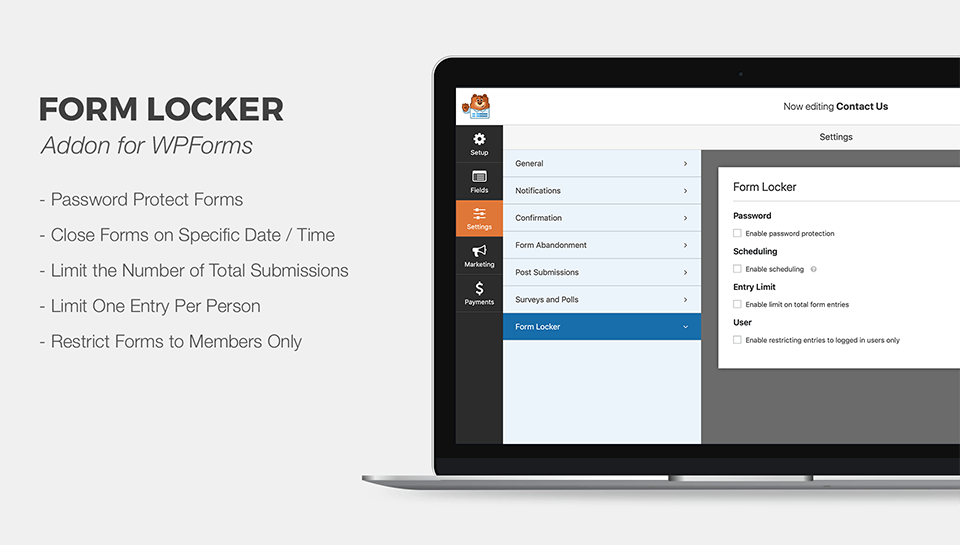 The Form Locker addon allows WPForms Pro or higher users to lock your WordPress forms with various permissions and access control rules, so you can decide and control who can fill out forms on your website.