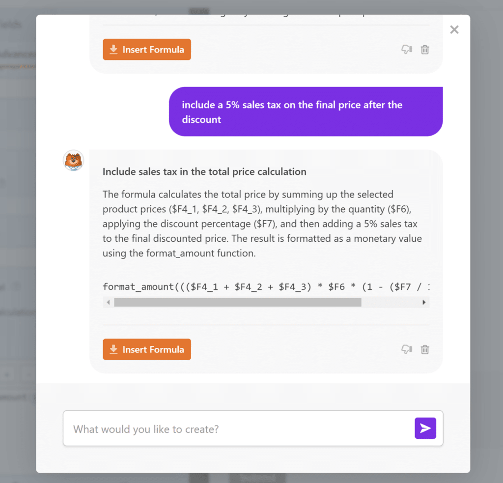 The AI immediately generated the correct formula. But then, I realized I forgot something. I went back to the chat and added, “include a 5% sales tax on the final price after the discount,” and the AI updated the formula instantly.