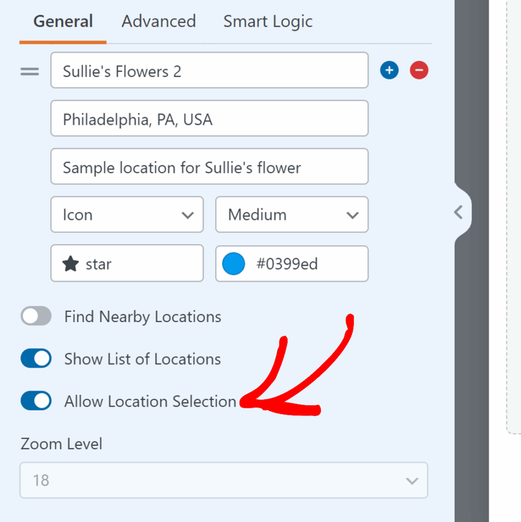 To add multiple locations to your map, click the plus icon (+) in the Locations section of the Field Options panel. Each location can have its own unique marker icon, color, name, and description.