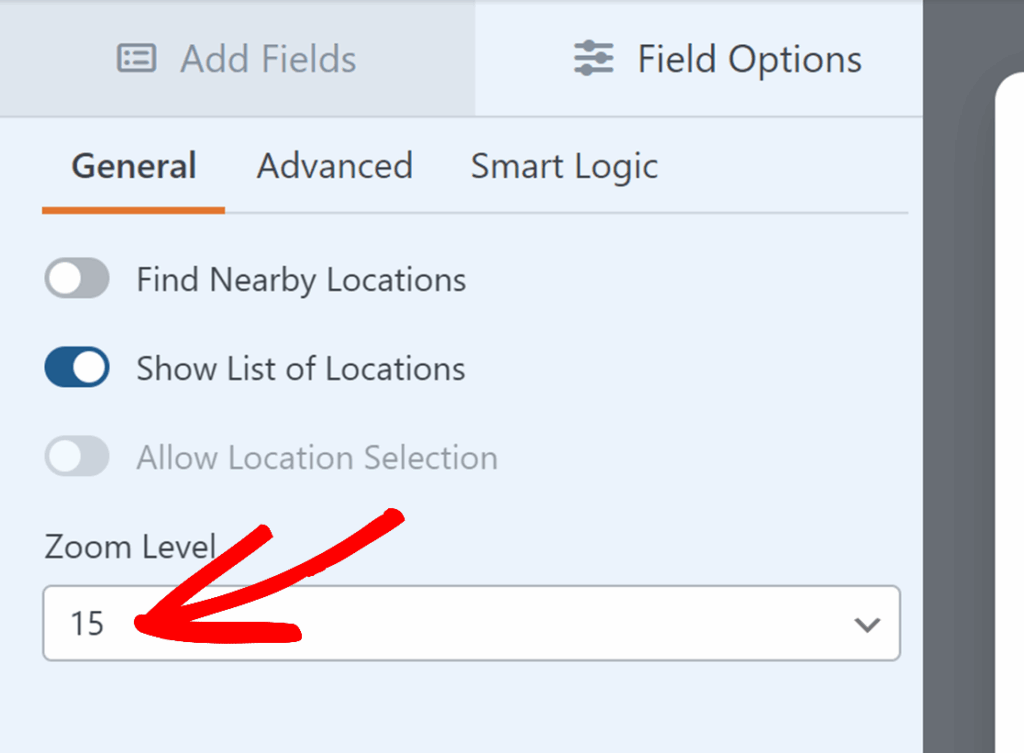 Adjust the Zoom Level field to control how close the map appears when it first loads. The default value is 15, which is the standard zoom level for embedded maps.