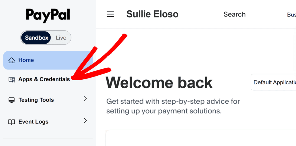 En una nueva pestaña o ventana del navegador, inicia sesión en tu cuenta de desarrollador de PayPal y abre «Aplicaciones y credenciales» en la barra lateral izquierda.