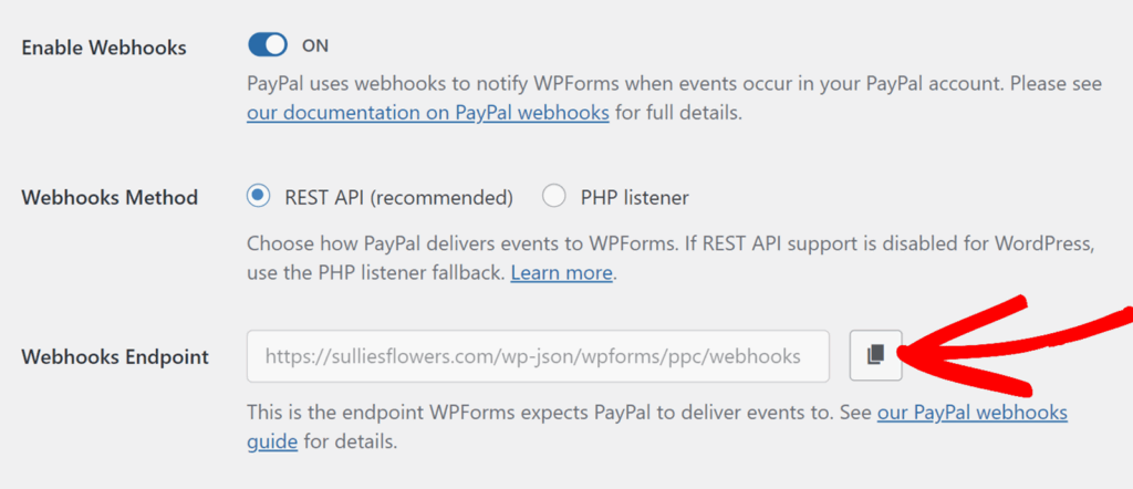 Para ello, vuelve a la pestaña del navegador en la que tienes abierta la página de configuración de WPForms. Una vez allí, tendrás que copiar elpunto final de Webhookshaciendo clic en el icono de copiar.