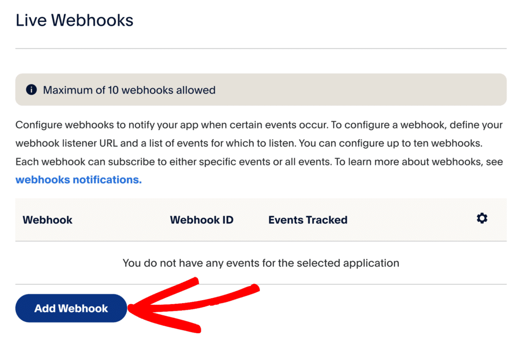 Esto abrirá la página de detalles de tus credenciales de API. Desplázate hasta el final de la página hasta llegar a la sección «Webhooks ».