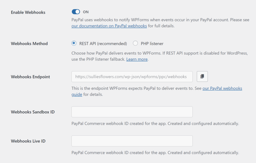 Los webhooks se configuran automáticamente tanto para los usuarios nuevos como para los ya existentes una vez que su sitio web utiliza la versión 1.10.0 o superior de WPForms y se ha conectado PayPal Commerce. Si la configuración automática no se completa correctamente, puedes configurar manualmente los ajustes de los webhooks siguiendo los pasos que se indican a continuación.