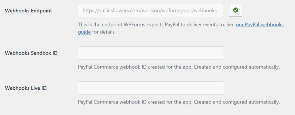 Si has conectado PayPal Commerce en la versión 1.10.0 o superior de WPForms, los webhooks se configuran automáticamente en tu sitio web, por lo que es posible que no tengas que configurarlos manualmente.