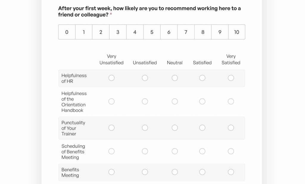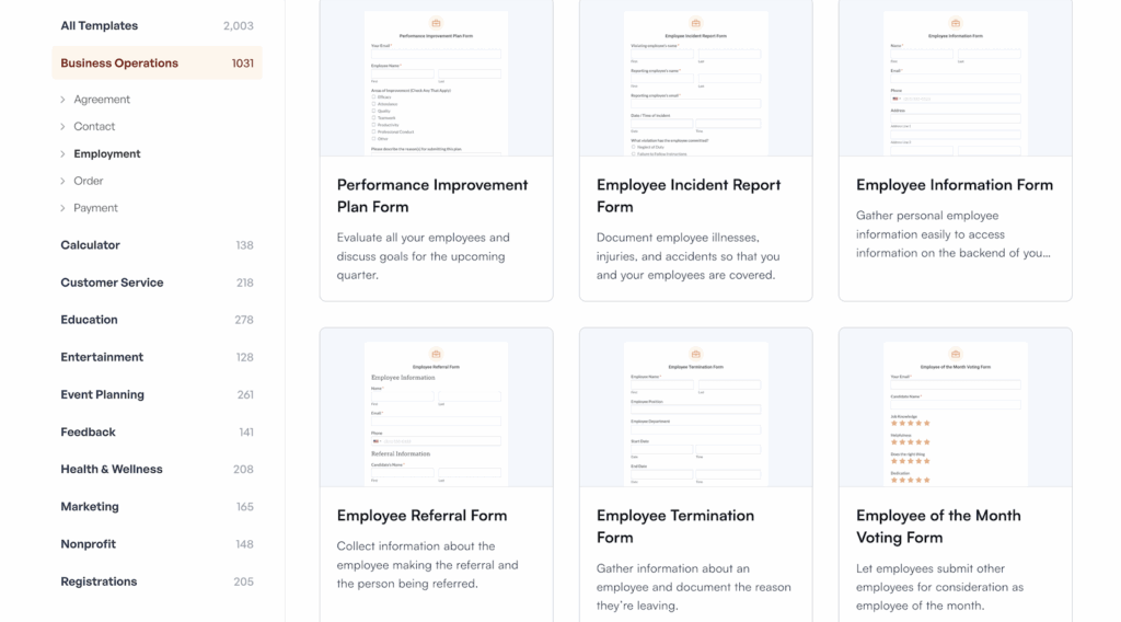 ¿Necesitas un formulario de solicitud de empleo? Hay una plantilla para eso. ¿Formularios de información de empleados para nuevas contrataciones? También los tenemos. Las encuestas de orientación para nuevos empleados, los formularios de solicitud de formación e incluso los formularios de entrevistas de salida están listos para usar. Puedes tener un formulario de solicitud con aspecto profesional en tu sitio web en menos de diez minutos.