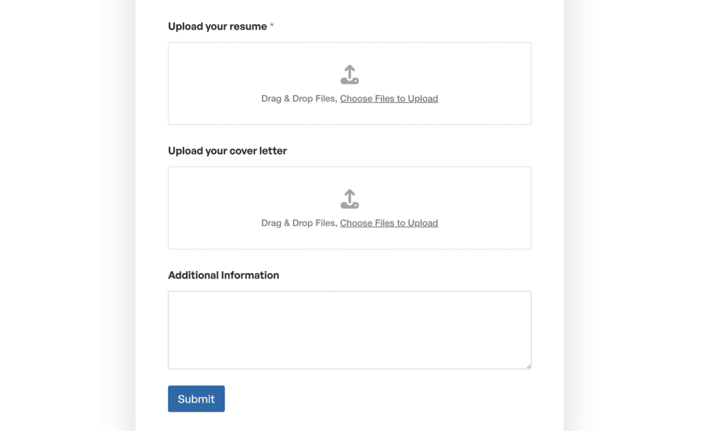 Puedes añadir todos los campos estándar, como información de contacto, autorización para trabajar, historial laboral... pero también puedes incluir campos para subir archivos, como currículums y portfolios.