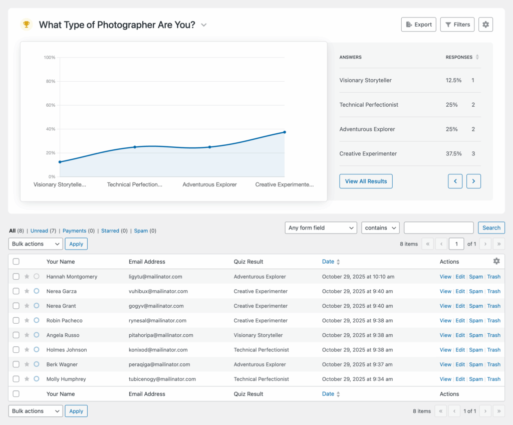 Yes, you can export quiz data and results as CSV or XLSX files for further analysis. Quiz results can also be exported as JPEG or PDF files with customizable graphs. Connect quiz submissions to your CRM, email marketing tools, and other platforms through WPForms integrations.
