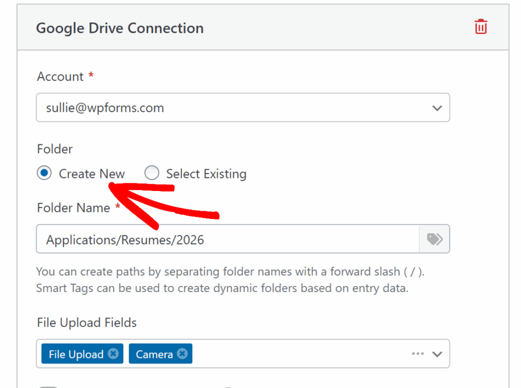 - 1. Créer un nouveau: Cette option vous permet de spécifier l'emplacement de stockage des fichiers téléchargés en créant des dossiers dans votre Google Drive connecté selon vos besoins. Le Nom du dossier Le champ est prérempli avec le nom de votre formulaire, mais vous pouvez le modifier à tout moment.
