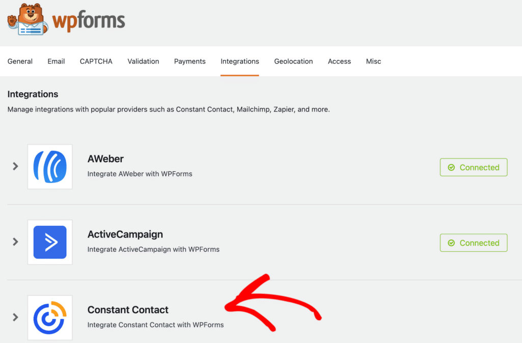 連携を設定するには、WordPressダッシュボードの「WPForms」»「設定」»「連携」に移動してください。ご利用のメールマーケティングサービスを選択し、画面の指示に従ってアカウントを連携させてください。